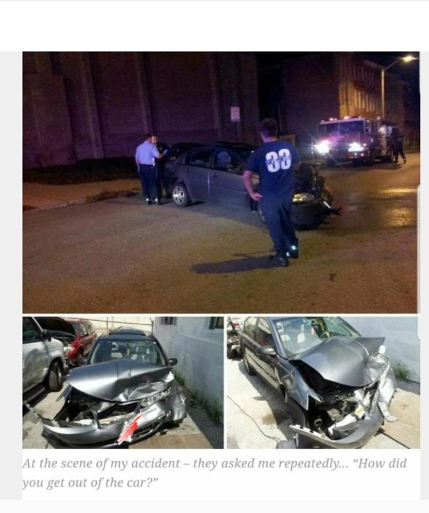 I allude to being pushed out of the car after being knocked unconscious by the airbag (photo inset)…. by my Aunt and Grandma, some photography from the aftermath and a photograph of them that I found afterwards that served as a confirmation.